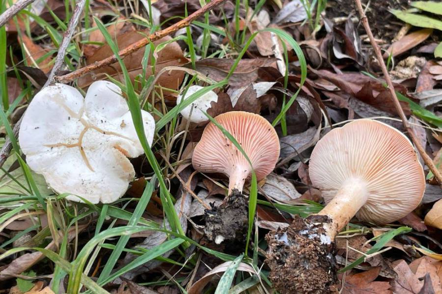 Der Rosablättrige Krempentrichterling erscheint hier gesellig; laut Literaturangabe soll er auch Hexenringe bilden.